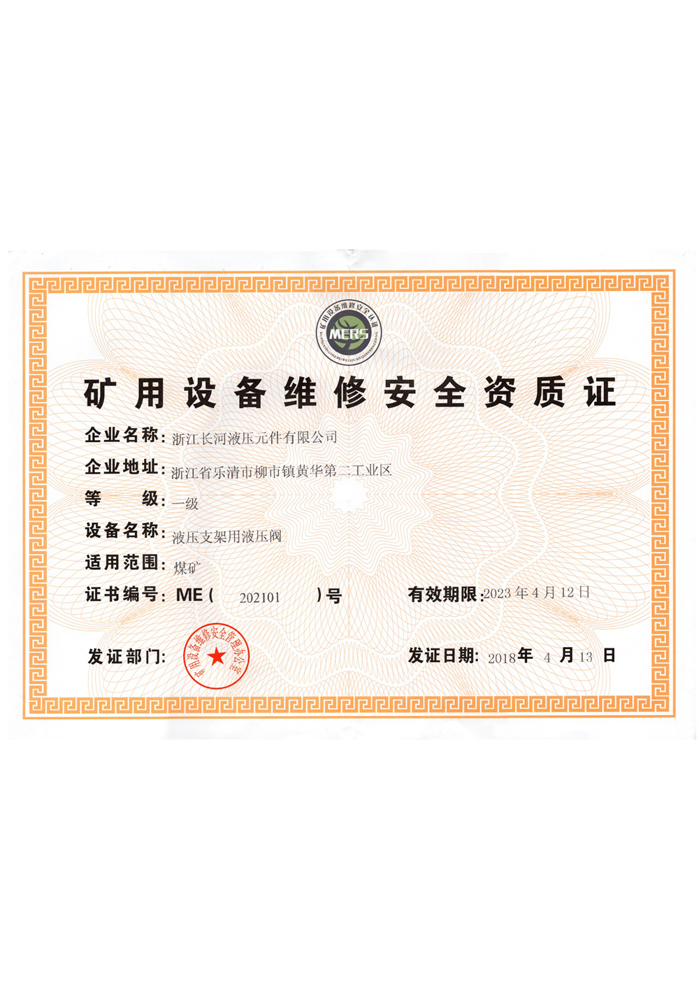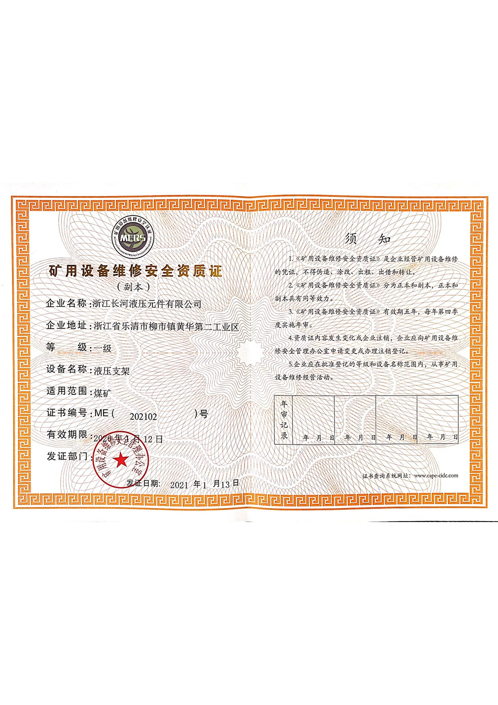 矿用设备维修安全资质证液压支架