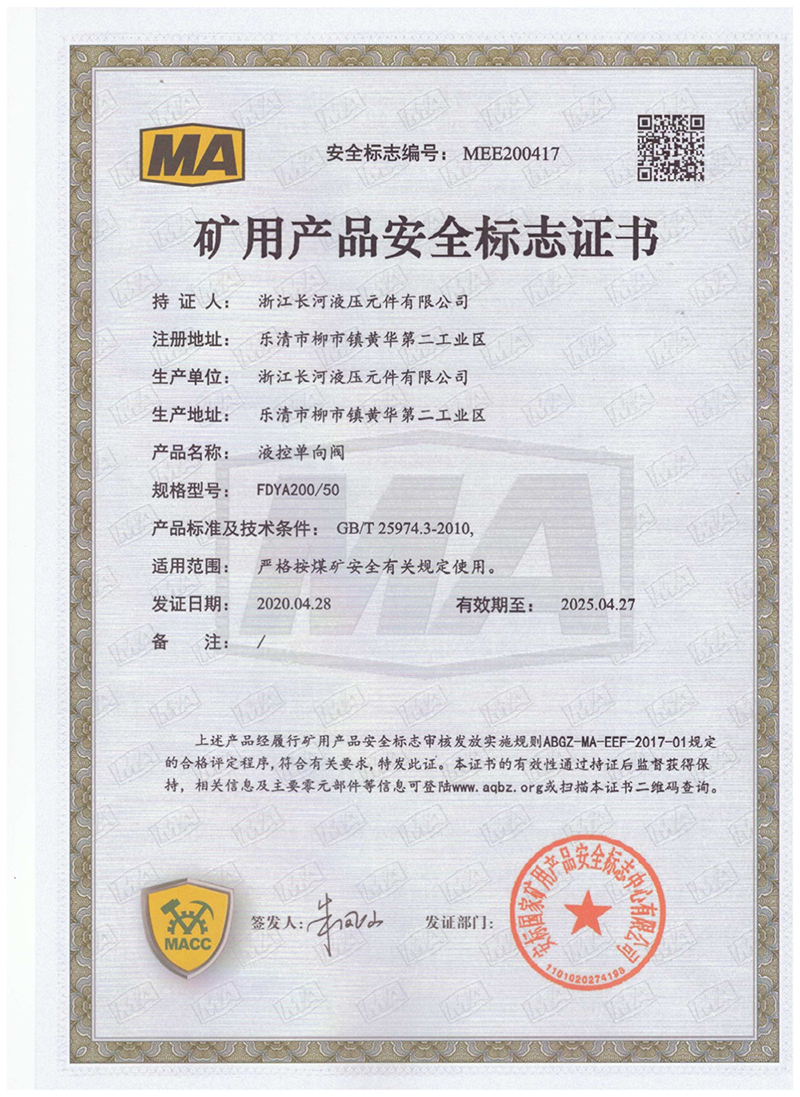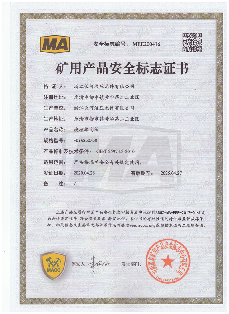 矿用产品安全标志证书液控单向阀
