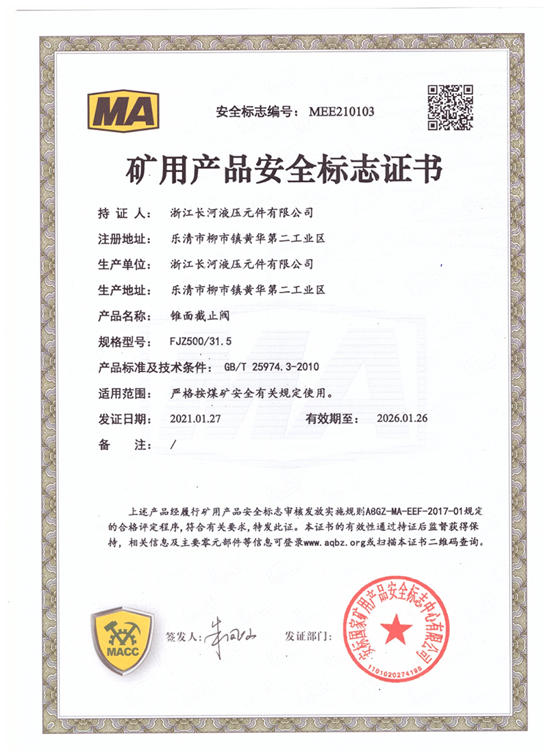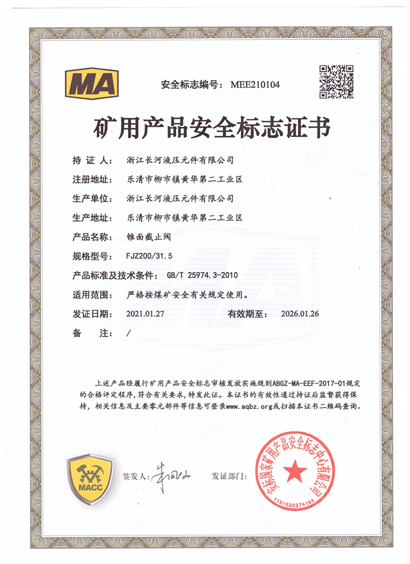 矿用产品安全标志证书锥面截止阀