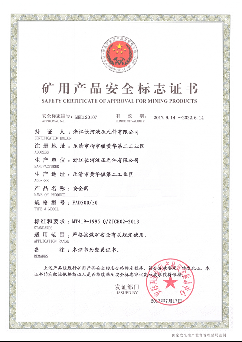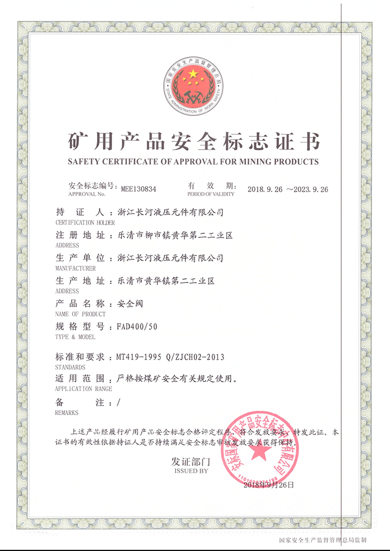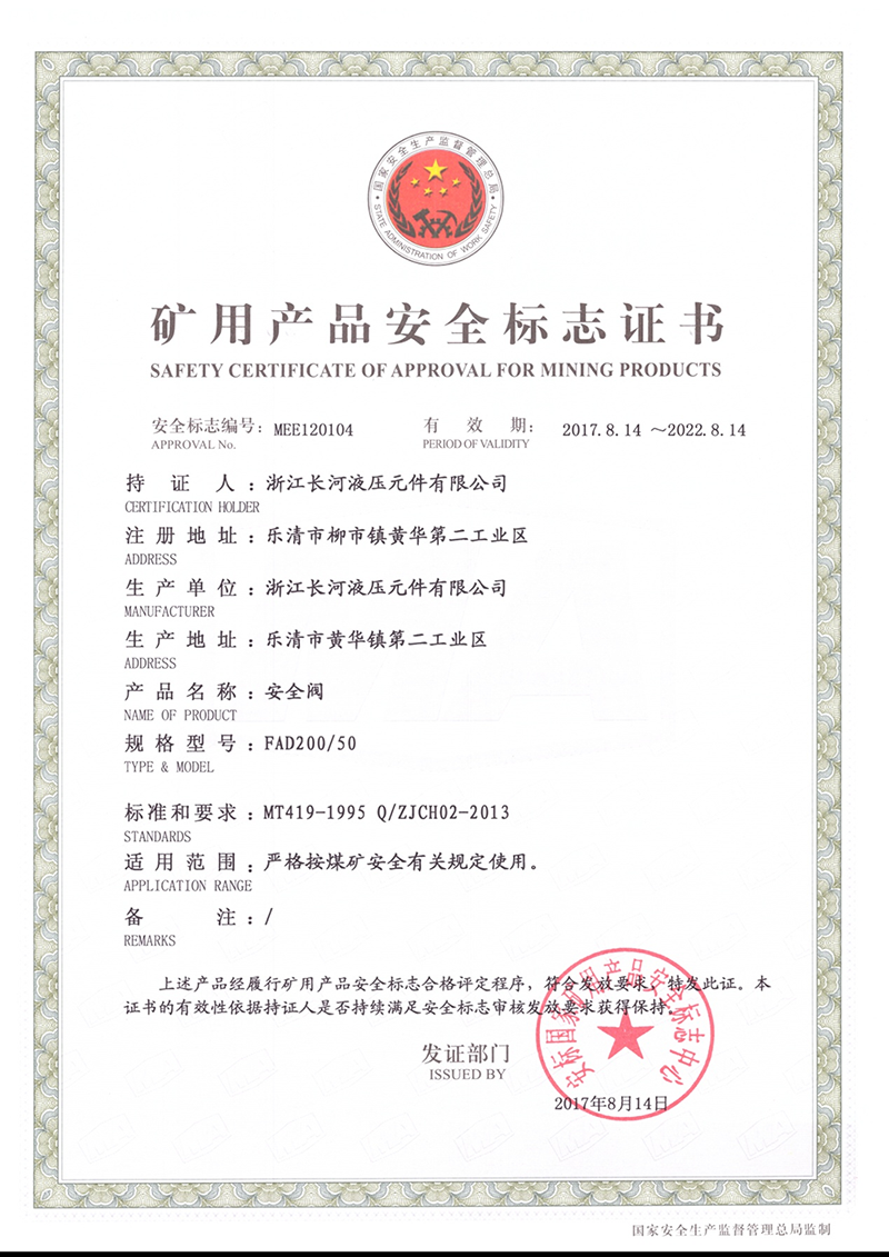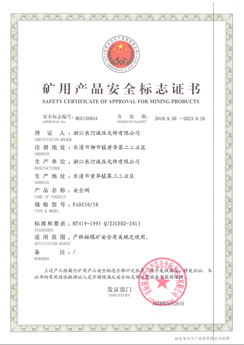 矿用产品安全标志证书安全阀
