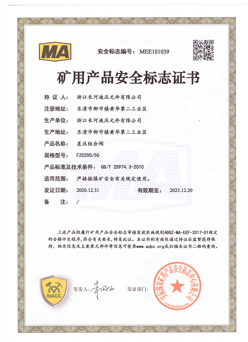 矿用产品安全标志证书差压组合阀